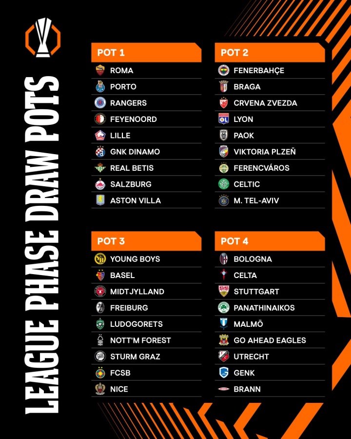 第一档:罗马、波尔图、格拉斯哥流浪者、费耶诺德、里尔、萨格勒布迪纳摩、皇家贝蒂斯、萨尔茨堡红牛、阿斯顿维拉